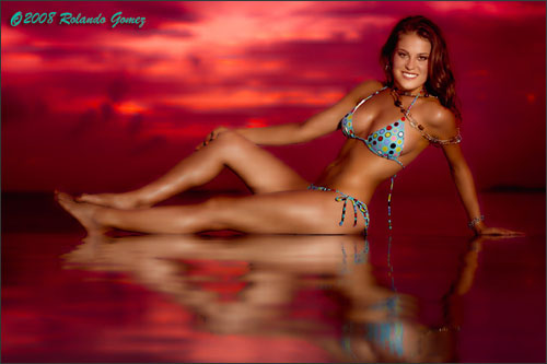 | Glamour Photographer Rolando Gomez recently wrote about using a simple white balance technique he used on his photoblog www.lensdiaries.com to add vibrant color to the ocean and sky in the background of his imagery. By white balancing the camera and light source to a specific color, anything illuminated in that color will appear normal while the rest of the shot will become saturated in the complementary color. |