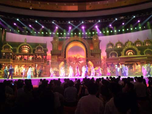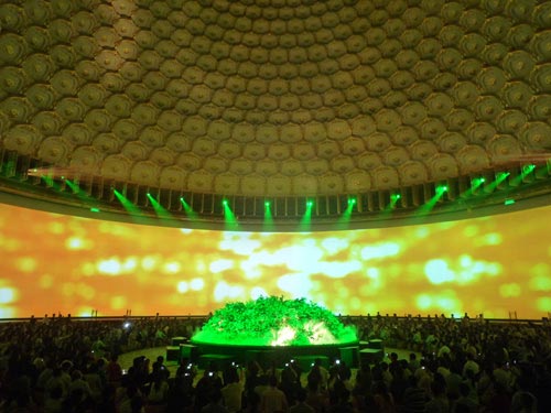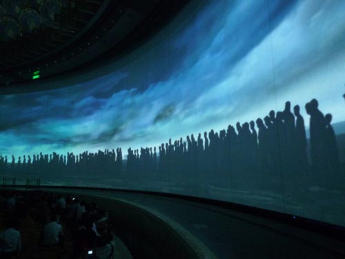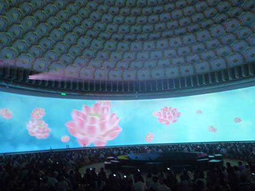 The ampitheatre in the Lingshan Buddhist Cultural Center uses 24 (Sanyo) Projectors for images in its various presentations. The Rosco screen, longer than an American football field, is curved in a 270° arc. The images, changing frequently, remain crisp and clear throughout the presentations.